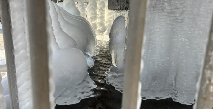 Şadırvanın musluğundan akan suyun donduğu anlar güzel görüntüler oluştururken kent meydanında bulunan bir kafenin çatısında oluşan 3 metrelik buz sarkıtları ise vatandaşlar için tehlike arz ediyor.