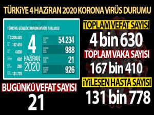 Sağlık Bakanlığı yaptığı açıklamada, son 24 saatte 21 kişi korona virüsten hayatını kaybettiğini, toplam can kaybının ise 4 bin 630'e yükseldiğini belirtti.