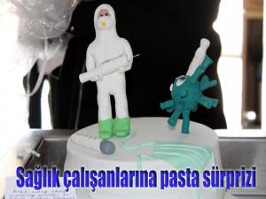 Erzurum'da bir grup vatandaş imalathanede yaptırdıkları pastalarla sağlık çalışanlarına sürpriz yaptı. Korona virüs' temalı pastalar, sağlık çalışanlarını güldürdü.