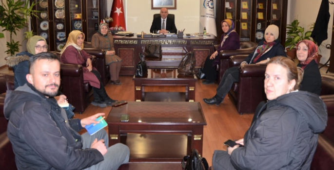 Ziyarette Saltuklu Kadın Kooperatifi Başkanı Hülya Saltuklu Başkan Özakalın’a, erham dokuması üzerine Üç Kümbetler figürü işlenmiş bir duvar saati hediye etti.
