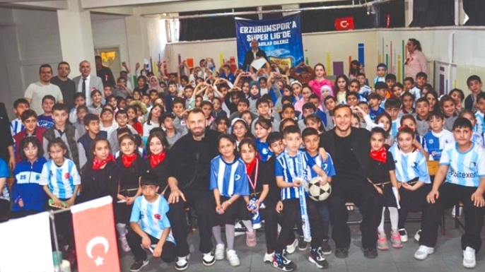 Erzurumspor'un başarılı futbolcuları Kaptanı Mustafa Yumlu ve Sefa Akgün, Evliya Çelebi İlköğretim Okulu'nu ziyaret ederek çocukları sevince boğdu. Ziyaretten habersiz olan öğrenciler futbolcuları, "Şaka mı bu yoksa rüya mı?" çığlıklarıyla karşıladı.