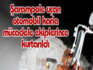 Erzurumun Tekman ilçesinde şarampole uçan otomobil karla mücadele ekipleri tarafından kurtarıldı.