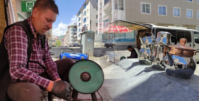 Bakır kapları, harlı ateşte kumlama yapıp pudralayarak temizleyen kalay ustası Mehmet Tokgöz, kaybolmaya yüz tutan mesleklerini büyük bir aşkla sürdürüyor.