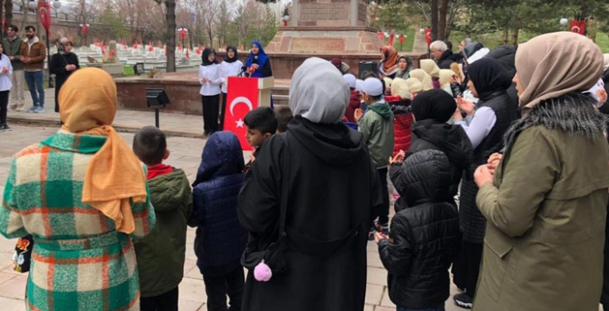 Programda okunan hatimlerin duası yapıldıktan sonra şehit mezarlarını gezen çocuklar, oradaki şehit aileleriyle beraber şehitlerin mezarları başında dua okudu.