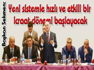 Büyükşehir Belediye Başkanı Mehmet Sekmen, referandum çalışmaları kapsamında düzenlenen toplantılarda muhtarlara Cumhurbaşkanlığı Hükümet Sistemi'ni anlatıyor.