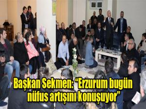 Büyükşehir Belediye Başkanı Mehmet Sekmen, Erzurumun tarihi binlerce yıl öncesine dayanan bir kent olduğunu hatırlatarak, şehrin bu uzun geçmişinden dolayı bir ticaret ve cazibe merkezi olduğuna vurgu yaptı. Sekmen, AK Parti iktidarlarından önceki son 50 yıllık dönemde şehrin bu unvanını kaybettiğini ve sürekli gerilediğini dile getirerek, Bir şehir düşünün ki; sürekli göç vererek, eriyerek ve tükenerek onlarca yılı arkasında bırakıyor. Ve AK Parti ne zaman ki iktidar oluyor; hem bu bölgenin ve hem de bu kadim şehrimizin makûs talihi değişmeye başlıyor. Bir zamanlar sürekli kan ve nüfuz kaybıyla gündem olan Erzurum, bugün artık nüfus artışını konuşuyor, değişimi konuşuyor, gelişimi konuşuyor. Yani Erzurum artık özüne dönüyor, kendini buluyor. Şundan emin olun ki; Erzurumu en son bundan 5 yıl önce gören Dadaşlar bile bugün Erzurumu tanımakta güçlük çekiyor. Biz bu şehre işte böyle bir gelişim ve değişim süreci yaşattık diye konuştu.