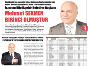 İmar Yapı Derneği'nin (İMYAD) 2015 yılı için "Rakamlar düzelmeden şehirler düzelmez" sloganıyla başlattığı otuz büyükşehir belediyesi arasından bütçe kullanım performanslarının resmi verileri doğrultusunda değerlendirme ve ödüllendirme projesi sonuçlarına göre en çok yatırımı yüzde 64.21 ile Erzurum Büyükşehir Belediyesi gerçekleştirdi. İMYAD Yönetim Kurulu Başkanı Mehmet Emin Ayaz, konuyla ilgili yaptığı değerlendirmede, "Otuz Büyükşehir Belediyesi arasında birinci olmak kolay değil. Yatırım performansları, tahsilat performansı, personel giderleri performansı ve harcama performansı dikkate alınarak kesin hesaplar incelenip söz konusu sonuca varıldı. Erzurum Büyükşehir Belediyesi birinci oldu. Yani bütçesinin yüzde 64.21'ini yatırımlara ayıran Erzurum Büyükşehir Belediyesi yatırımlarıyla zirveye oturdu" dedi.