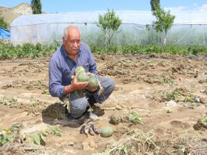 Yüksel Atmacaya ait seralar ve 2,5 dönüm ekili arazideki ekilen karpuz, kavun, domates, salatalık, patlıcan, biber ve soğanı sel suları tahrip etti.