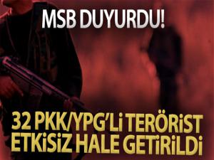 Bakanlığın sosyal medya hesabından yapılan açıklamada, "Kahraman Komandolarımız; Barış Pınarı bölgesi güneyine sızma girişiminde bulunan PKK/YPG'li terörist gruba başarılı şekilde müdahale ederek 32 PKK/YPG'li teröristi etkisiz hale getirdi" denildi.(iha)