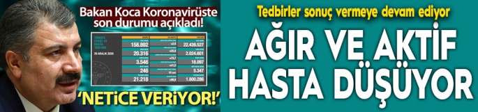 Sağlık Bakanı Fahrettin Koca, Twitter hesabından yaptığı paylaşımda, “Bugün tespit edilen 3.546 yeni hastamız var. Ağır hasta ve aktif vaka sayımız düşmeye devam ediyor. Tedbir ve kısıtlamalar netice veriyor. Daha belirgin neticeler alacağımıza inanıyoruz. Bunu birlikte başarabiliriz. Birlikte mücadele virüsten daha güçlüdür” ifadelerine yer verdi.