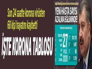 Sağlık Bakanı Fahrettin Koca, Türkiye Günlük Koronavirüs Tablosunu paylaştı. Tabloya göre, son 24 saatte 101 bin 119 kişiye test yapıldı, bin 467 kişide korona virüs tespit edildi. 68 kişi virüs nedeniyle hayatını kaybederken, bin 116 kişinin tedavisi tamamlandı.
