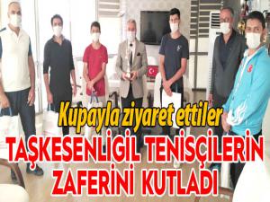 Taşkesenligil, şampiyon raketleri tebrik etti. Tenisçiler kazandıkları kupaları Taşkesenligile hediye etti.