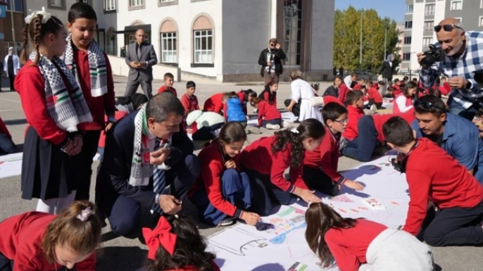 Milli Eğitim Bakanı Yusuf Tekin burada yaptığı konuşmada, "Evet biz eğitim metodolojisini konuşalım. Eğitimde yapay zekayı konuşalım, teknolojiyi konuşalım. Ama bütün bunlar niye yapıyoruz biz? Niye çocukları okula götürüyoruz? Niye eğitiyoruz? Kariyer canavarları mı yetiştirmek istiyoruz? Çıkar ve sadece kendi çıkarlarını düşünen vahşiler mi yetiştirmek istiyor Başkasını düşünmeyecekse insanı düşünmeyecekse, karşısındaki insanın hakkını, hukukunu düşünmeyecekse biz çocuklara niye eğitim veriyoruz arkadaşlar? Başkasına zarar verecek, insanlığı öldürecek silah yapacak, içinde insani değerleri olmayan bir varlığı biz ne yetiştiriyoruz? Eğitim sistemlerinin temel vasfı insan hakları, demokrasi, barış, dünyada beraber yaşama ile ilgili bir farkındalık oluşturmak. İnsanlara bunu verecek işleri yapmamız lazım. Bizim okullarımızda. Müfredatlarımızda en başa bunu yazmamız lazım. Bunu dememiz lazım. Demeliyiz ki biz insanlığa hizmet edecek insani değerleri önceleyecek ve bu dünyayı hepimiz için yaşanabilir kılacak bireyler yetiştirmemiz lazım. Sonra bunu nasıl yapacağımızı tartışabiliriz. Fakat asıl parametremizi asıl önermemizi unutursak o zaman o değerden yoksun ve bugün binlerce insanı, binlerce çocuğu öldüren vahşiler yetişmiş Oluyor. Kendi çıkarı için dünyanın neresinde olursa olsun insanları öldüren yapılar, siyasi iktidarlar ortaya çıkıyor. Bunlar önlemenin yolu bu şekilde adımlar atmak. Biz de Türkiye'yi maarif modeliyle aslında bir adım attık ve uluslararası arenada da savunurken evet diğer önermeleri de yani modern eğitim teknolojilerinin, eğitimdeki modern metodolojinin bize gerektirdiği bütün doneleri de eğitim sistemimize koyacağız, koyuyoruz Ama tüm bunları yaparken biz bunları niye yapıyoruz sorusunu da yukarıda ana paradigma olarak onu koyduk. Biz diyoruz ki biz bütün bunları insanlığa hizmet etmek için, bizim devlet geleneğimiz, bizim toplum geleneğimiz de bize bunu zaten dik geziyor. Böyle davranma dikte ediyor. Bugün de bütün bunları yaparken istediğimiz şey yani bugün Filistin'deki kardeşlerimizin davasına sahip çıkarken istediğimiz şey Türk devlet geleneğinin bize atalarımızın yadigar bıraktığı dünyada bir mazlum varsa onun derdine koşun. Onun yardımına koşun. Bu bizim için bir ata yadigarı bir husus. Ve bugün biz bunu yapıyoruz. Bir tarafta, bir taraftan da dünyada insanın ortak değerlerine sahip çıkacak bir konuşturmaya çalışıyoruz. Bu sebeple bugün okullarımızda bu etkinliği yapalım istedik. Yani yedi Ekim olduğu için. Bakın arkadaşlar bir yaşın çoğu bir yaşın altında olmak üzere. Yaklaşık bu iki yılda yaklaşık elli iki dakikada bir öldürüldü İsrail tarafından. Ya bu çocukların nasıl bir zararı olmuş bunların? Yaşam hakkı elinden alınanlar dışında sakat bırakılanlar, annesi, babası şehit edildiği için yetim kalanlar, öksüz kalanlar, eğitim öğretimi hakkından mahrum bırakılanlar hariç onları saymıyoruz, bilmiyoruz onları. Oradaki hasarın büyüklüğünden haberimiz yok. Peki insanlığın bu problemine biz sahip çıkmayacaksak, bakın dünyanın neresine giderseniz gidin konuşurken bir gün bir şey olursa Türkler bizi kurtarır. Türkler bizim hakkımızı savunur diyen bir mirasımız, bir geleneğimiz var bizim. Dolayısıyla biz de bugün bu farkındalığa destek olmak üzere okullarımızı böyle bir şey başlattık" diye konuştu.