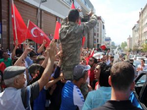 Erzurum'da düzenlenen teröre tepki yürüyüşü sırasında resmi üniformalı jandarmaları cadde üzerinde gören yüzlerce vatandaş, askerlere sarılarak bağırlarına bastılar.