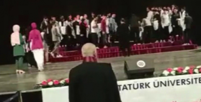 Atatürk Üniversitesi Tıp Fakültesi geleneksel önlük giydirme töreninde sahnede öğrencilerin bulunduğu platform bir anda çöktü.