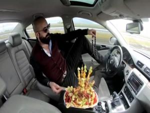 Trafikte çekilen görüntüyü görenler gözlerine inanamadı. Yanında kocaman meyve tabağı, elinde tespih olan Kadir E. isimli şoför direksiyonu ise ayağı ile kontrol etti. Görüntüyü izleyenler tepki gösterirken Kadir E. videoyu mizah amaçlı çektiğini söyledi.