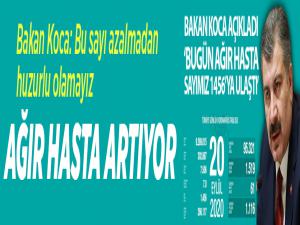 Sağlık Bakanı Fahrettin Koca, resmi sosyal medya hesabı üzerinden yaptığı paylaşımda, Bugün ağır hasta sayımız bin 456'ya ulaştı. Artış hızı yavaşlamış olsa da bu sayı azalmadan huzurlu olamayız. Birlikte mücadele virüsü yenecek en önemli güç. Sağlık çalışanlarımıza vefa göstergemiz tedbirde güç birliğidir dedi.
