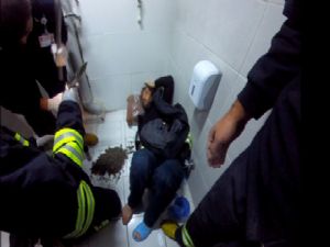 İhbar üzerine hastaneye gelen itfaiye ekipleri yaklaşık 1 saatlik çalışma sonucu tuvaleti kırarak genç adamın kolunu sıkıştığı yerden kurtardı.