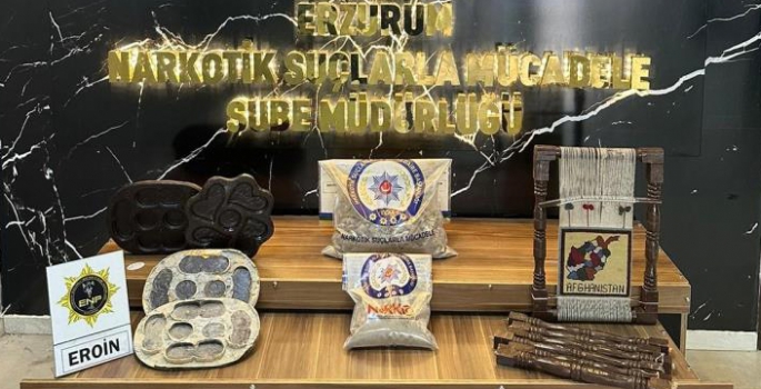 Erzurum Emniyet Müdürlüğü Narkotik Suçlarla Mücadele Şube Müdürlüğünce uyuşturucu madde ticaret ve sevkiyatına yönelik yapılan analiz çalışmaları sonucunda tespit edilen İran plakalı yolcu otobüsünde narkotik madde arama köpeği Eris ile yapılan aramada, valiz içerisinde bulunan 27 parça halinde kahve renkli ahşap bölmeli çerezlik iç kısımlarına ve minyatür ahşap halı dokuma tezgahının ayak kısımlarına zulalanmış toplam 5 kilo 700 gram eroin ele geçirildi.