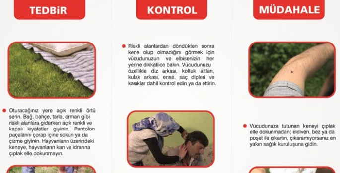 Sağlık Müdürlükleri bahar ayları ile birlikte ortaya çıkan kene tehlikesine karşı camii, okul ve benzeri yerlere bilgilendirici afiş-broşürler dağıtırken, hastalığa yakalanan kişilerin kan, vücut sıvıları ve çıkartıları ile hastalık bulaşabildiğini hatırlatılarak, “Hasta ile temas eden kişiler gerekli korunma önlemlerini almalıdır. Hastalığa sebep olan mikrobun taşıyıcısı, saklayıcısı ve bulaştırıcısı olan keneler uçmayan, zıplamayan, yerden yürüyerek vücuda tırmanan eklem bacaklı hayvanlardır. Vücuda tutunan veya hayvanların üzerinde bulunan keneler kesinlikle çıplak el ile öldürülmemeli ve patlatılmamalıdır. Keneler üzerine sigara basmak, kolonya, gaz yağı gibi maddeler dökmek kenenin kasılmasına sebep olarak vücut içeriğini kan emdiği kişiye aktarmasına sebep olacağı için yapılmamalıdır.” dediler.
