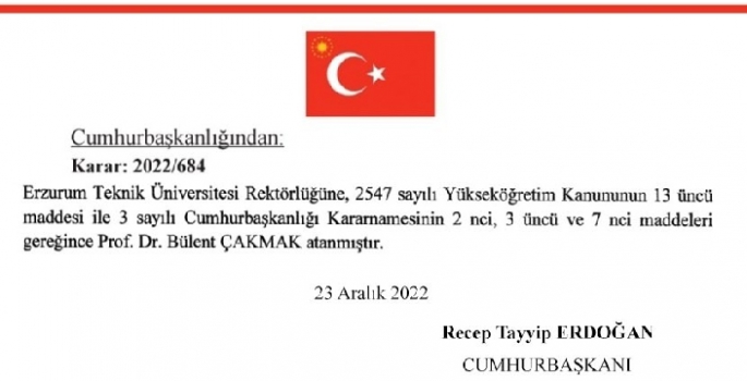 Cumhurbaşkanı Recep Tayyip Erdoğan tarafından Erzurum Teknik Üniversitesi (ETÜ) 4. dönem Rektörlüğü görevine 24.12.2022 tarihli Resmî Gazete’de yayımlanan Yükseköğretim Kanunu’nun 13. maddesi ile 3 sayılı Cumhurbaşkanı Kararnamesi’nin 2, 3 ve 7. maddeleri gereğince Prof. Dr. Bülent Çakmak yeniden atandı.