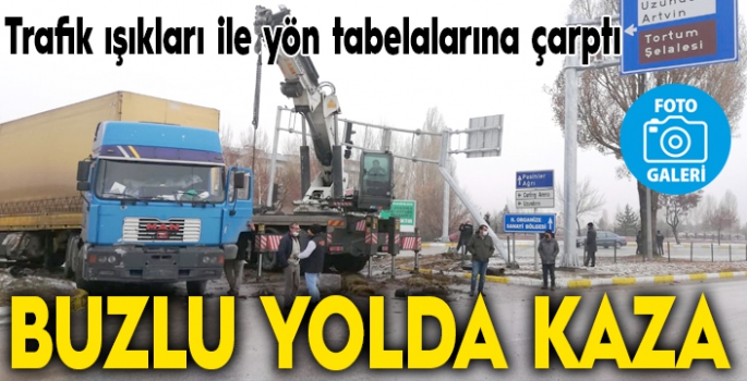 Erzurum şehir girişinde meydana gelen trafik kazasında, Pasinler istikametinden Erzincan istikametine seyreden 27 EE 305 plakalı tır yoldaki buzlanma nedeniyle sürücünün direksiyon hakimiyetini kaybetmesi sonucu Asri Mezarlık kavşağında refüje çıkarak trafik ışıklarına çarpıp durabildi.