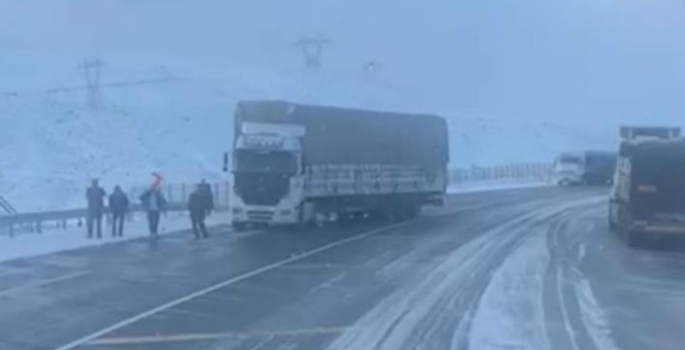 Erzurum-Çat karayoluna yağan kar sonrası soğuk havanın etkisiyle yollar buz pistine döndü. Kış lastikleri olmayan onlarca tır ise yollarda kaldı.