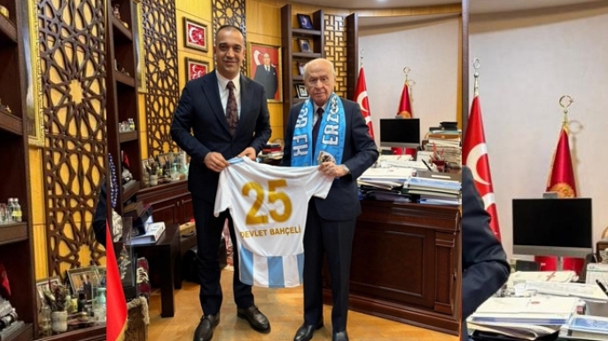 Başkent’te gerçekleşen ziyarette İl Başkanı Adem Yurdagül, Genel Başkan Bahçeli’ye kulübün sembolü olan mavi-beyazlı atkı ve Erzurum’un plaka kodu olan 25 numaralı formayı hediye etti.
