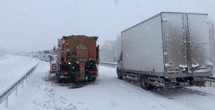 Yolda kayan tır ve kamyonlar yolu trafiğe kapatırken, yolun gidiş ve geliş istikametinde yüzlerce araç mahsur kaldı.