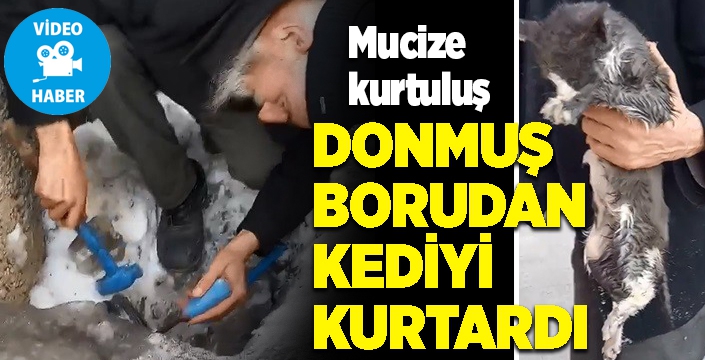 Erzurum’da buz tutan bahçe borusunun içerisinde mahsur kalan kediyi Cevat Çınar isimli vatandaş çekiç ve murçla buzu kırarak kurtardı. Borudan buz tutmuş halde çıkan kediyi görenler, duygu dolu anlar yaşadı.