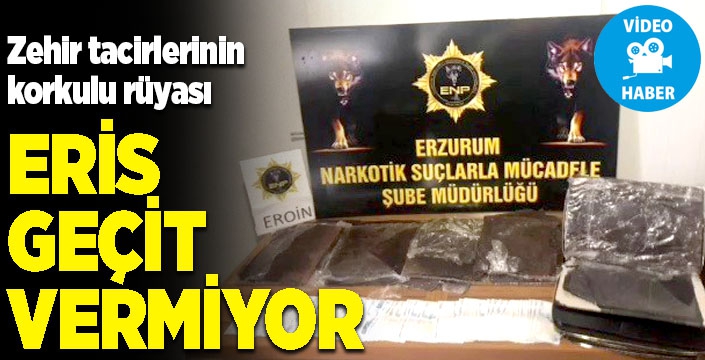 Erzurum-Erzincan karayolu üzerinde polis ekipleri tarafından durdurulan yolcu otobüsünde narkotik köpek Eris ile birlikte yapılan aramada bir yolcuya ait çantada 3 kilo 50 gram eroin ele geçirildi.