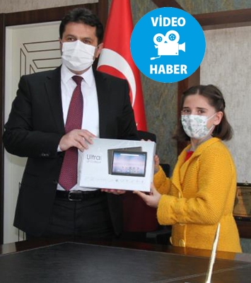 Milli Eğitim Müdürlüğü’nde düzenlenen törende kendisini ziyaret eden Celal Akın İlkokulu 4. sınıf öğrencisi İdil Duru Kalçık’ı makamında ağırlayan milli Eğitim Müdürü Salih Kaygusuz, Kalçık’a tablet hediye etti.